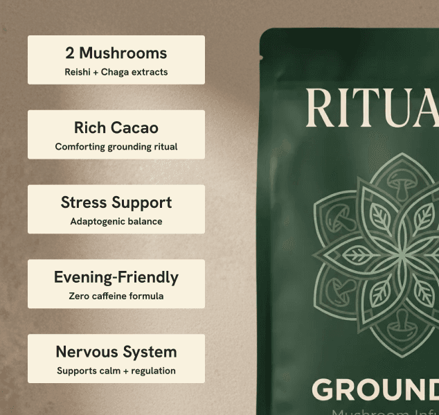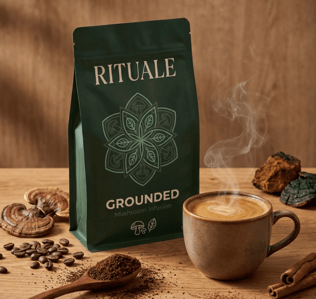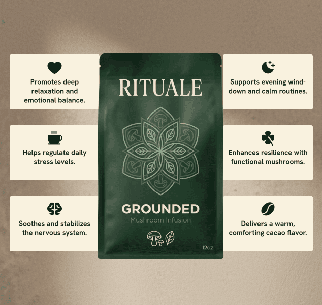 Grounded is a comforting mushroom infusion crafted for slow evenings, mid-day resets, and moments when you need to come back to yourself. Rich cacao, reishi, and chaga create a warm, earthy drink that supports relaxation and long-term resilience.